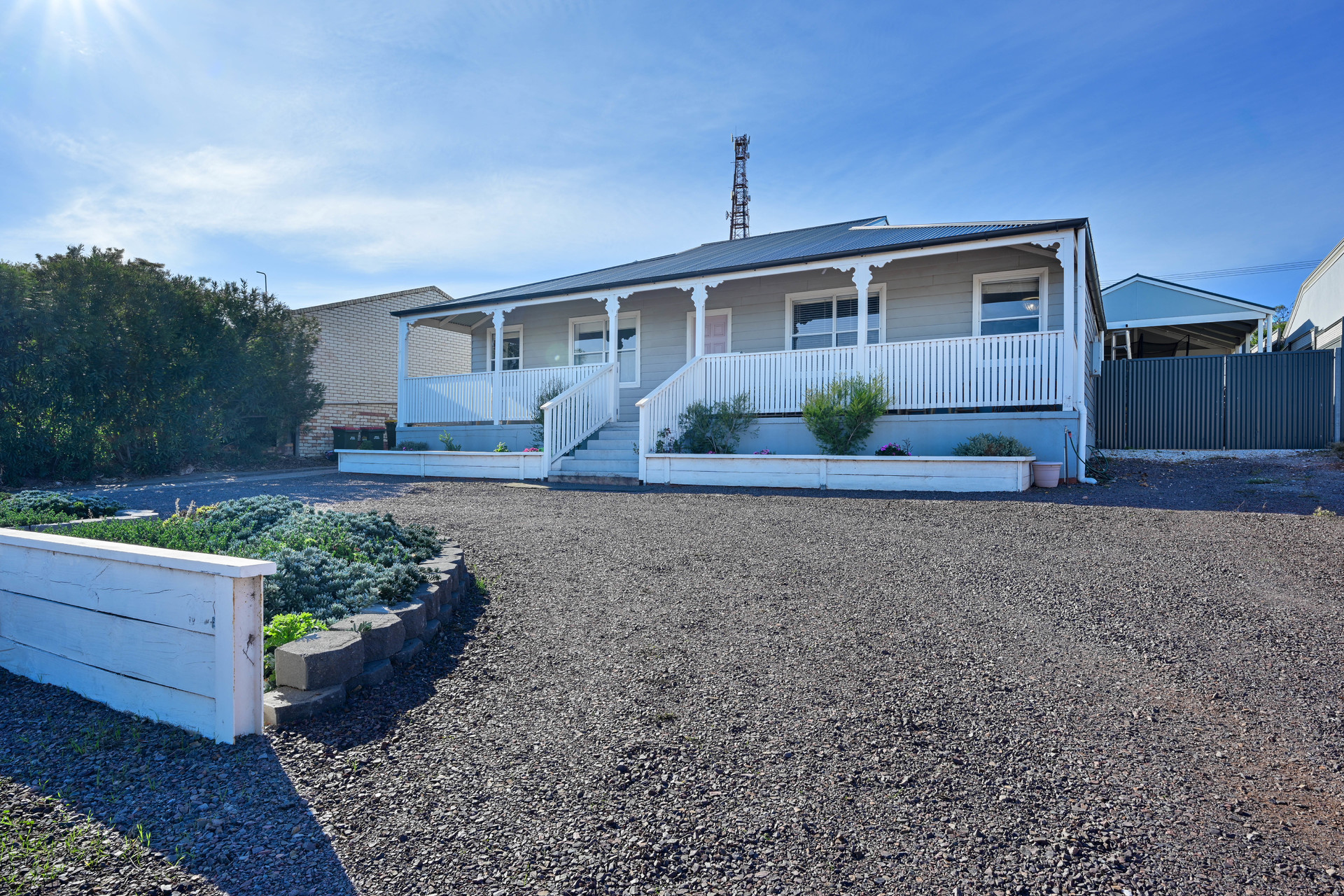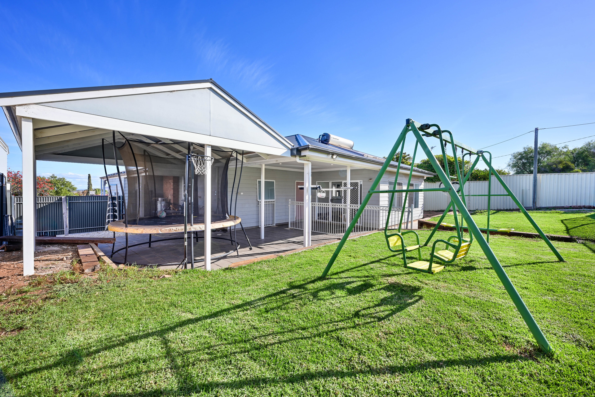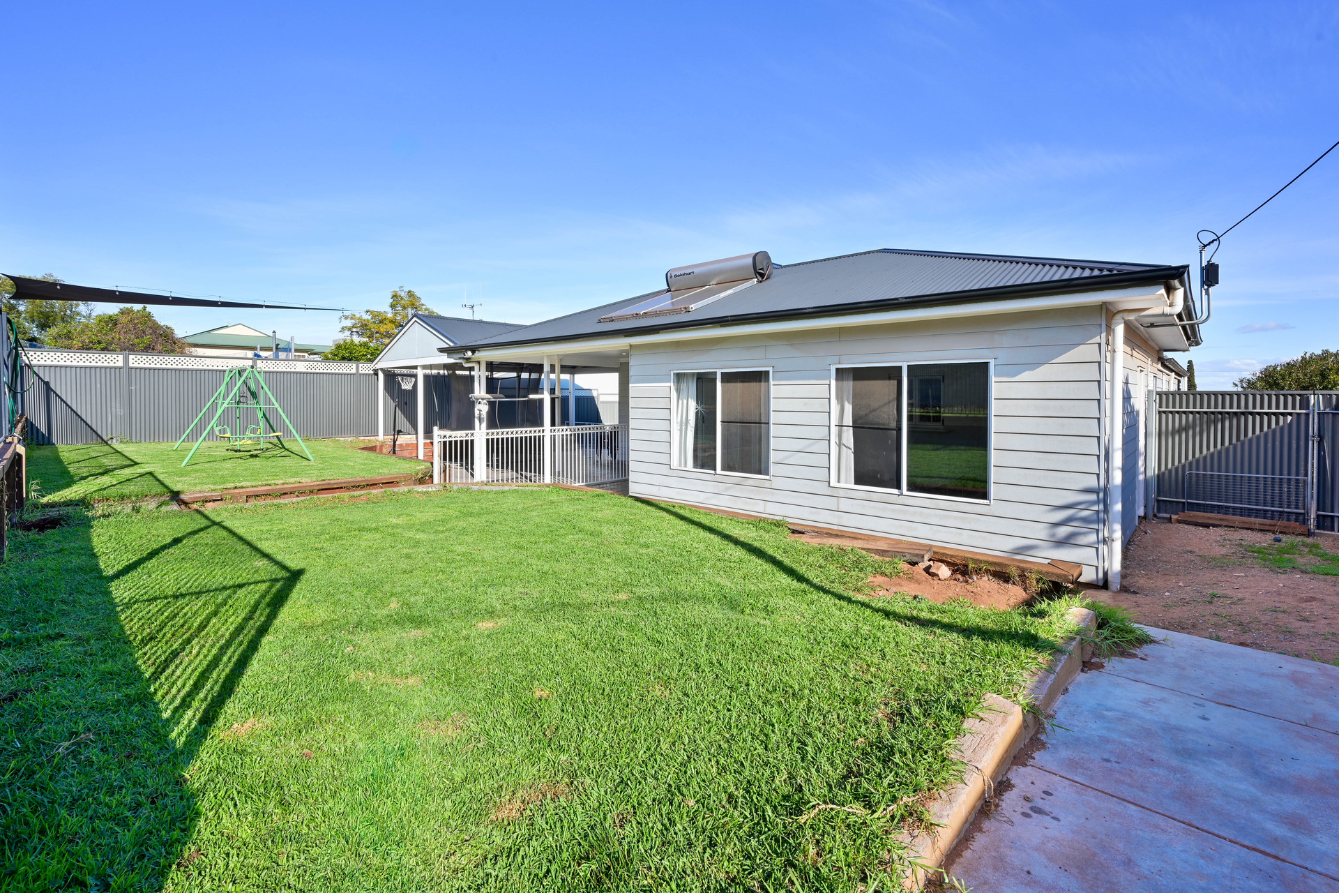 Offering a huge laundry with ample storage, barn style sink and even a built-in dog wash station Split system air-conditioning to lounge, and 3 bedrooms 6.6kw solar system Pitched roof colorbond rear verandah Double gate access to both sides of the property An elevated allotment providing for lovely views from the front porch, lounge, front bedrooms and even the walk-through robe! Established front and rear gardens, even half the lawn has a watering system Colorbond carport can be installed to the left side of the property – terms and conditions to be negotiated and confirmed within the contract of sale
