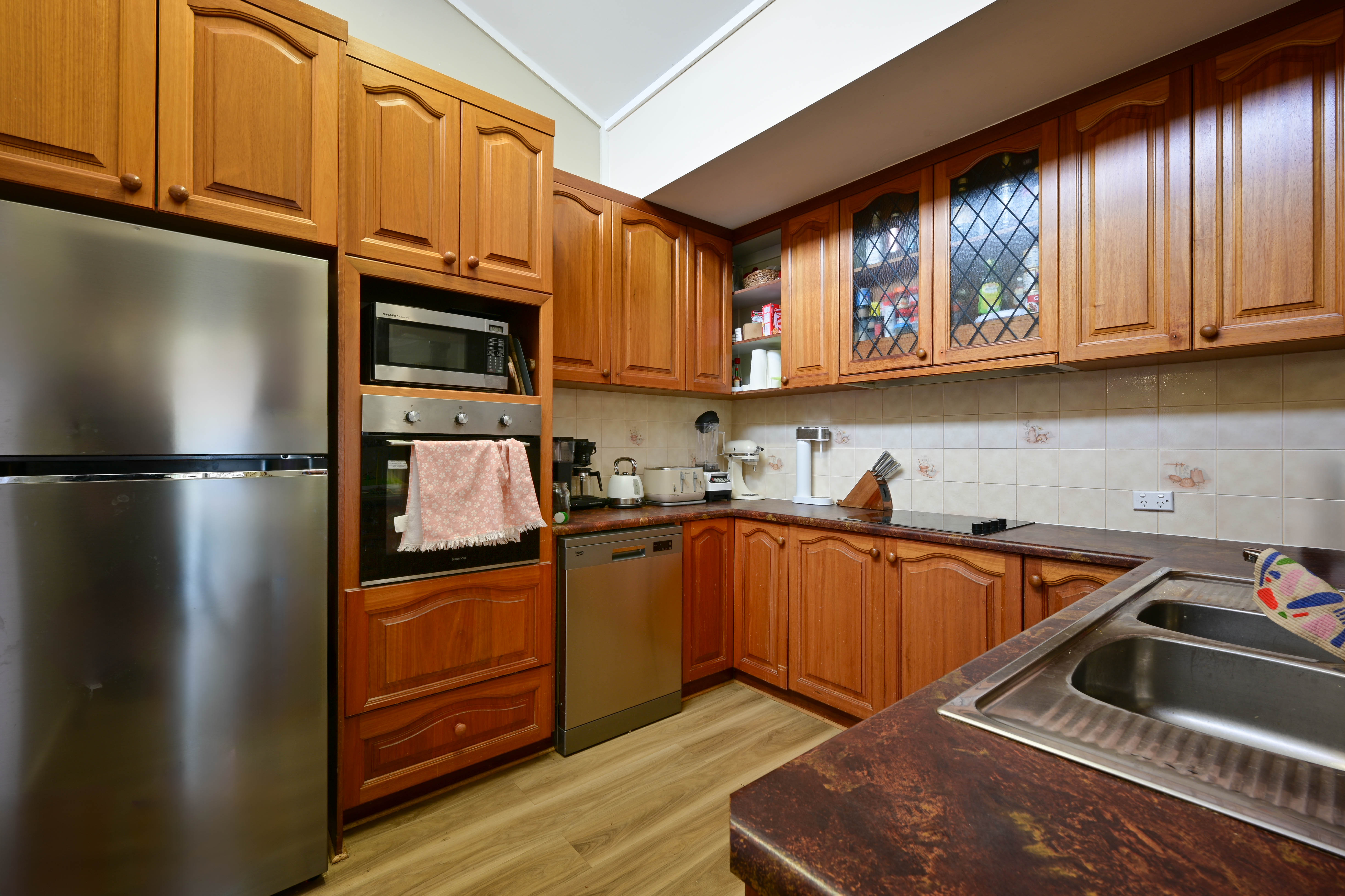 Upon entry you are welcomed into the entryway, to the right you have the bright-filled carpeted living space complete with a split system air conditioner, wall unit and gas heater for all year round comfort leading you to the kitchen. The kitchen is set in a functional design and features beautiful wooden cabinetry offering you plenty of storage and bench space, a double sink, dishwasher, oven, an electric cooktop plus a range hood.