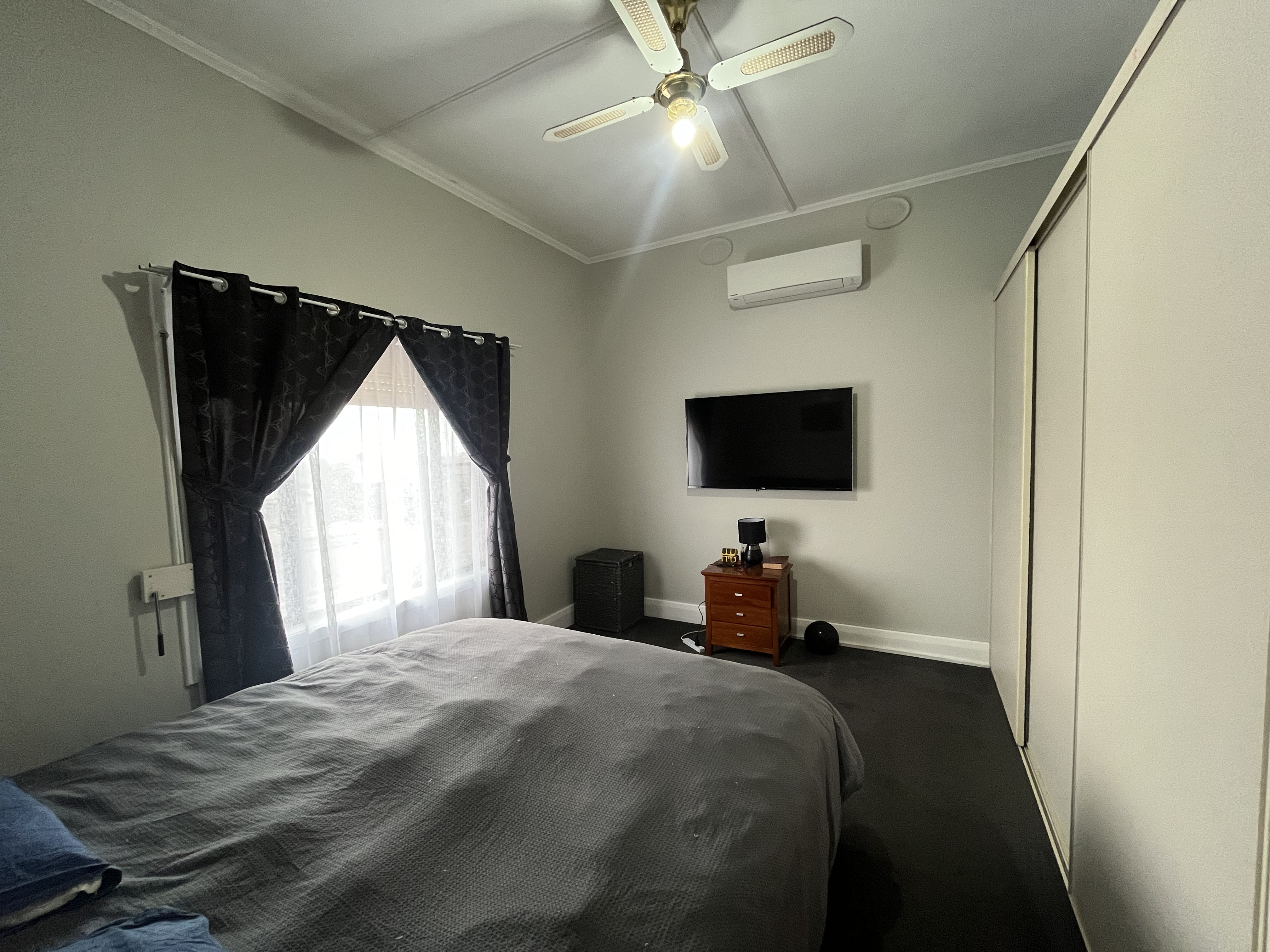 Following back through to the entry hallway places three good sized bedrooms designed for comfort which all include carpeted flooring, ceiling fans curtains and roller blinds. Bedrooms one and two are equipped with roller shutters for a good night's sleep. Bedroom two is also equipped with a built-in robe and split system for all year round comfort. You'll also find the functional designed bathroom complete with a shower over the bath, vanity and a toilet.